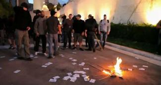 Όταν έφτασαν στο πλάι του Μνημείου του Αγνώστου Στρατιώτη τις έκαψαν και ξεδίπλωσαν πανό κατά της λιτότητας και των μνημονίων, ενώ ακούστηκε το σύνθημα, "ένας είναι ο δρόμος λαέ για να νικάς, ΕΑΜ, ΕΛΑΣ, Μελιγαλάς".