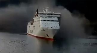 Φωτιά ξέσπασε μεσοπέλαγα στο γκαράζ του πλοίου Olympic Champion στο οποίο επέβαιναν 613 άνθρωποι. Στο πλοίο βρίσκονταν αρκετές νταλίκες, πολλές εκ των οποίων με εύφλεκτο υλικό. Στο βίντεο ντοκουμέντο που παρουσίασε το κεντρικό δελτίο ειδήσεων του Open, φαίνονται οι μαύροι καπνοί από το κατάστρωμα που έχουν γεμίσει την ατμόσφαιρα.