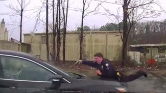 Ο αστυνομικός πυροβολάει πέντε φορές πριν βρεθεί στο παμπρίζ του αυτοκινήτου, που συνεχίζει να κινείται αργά.