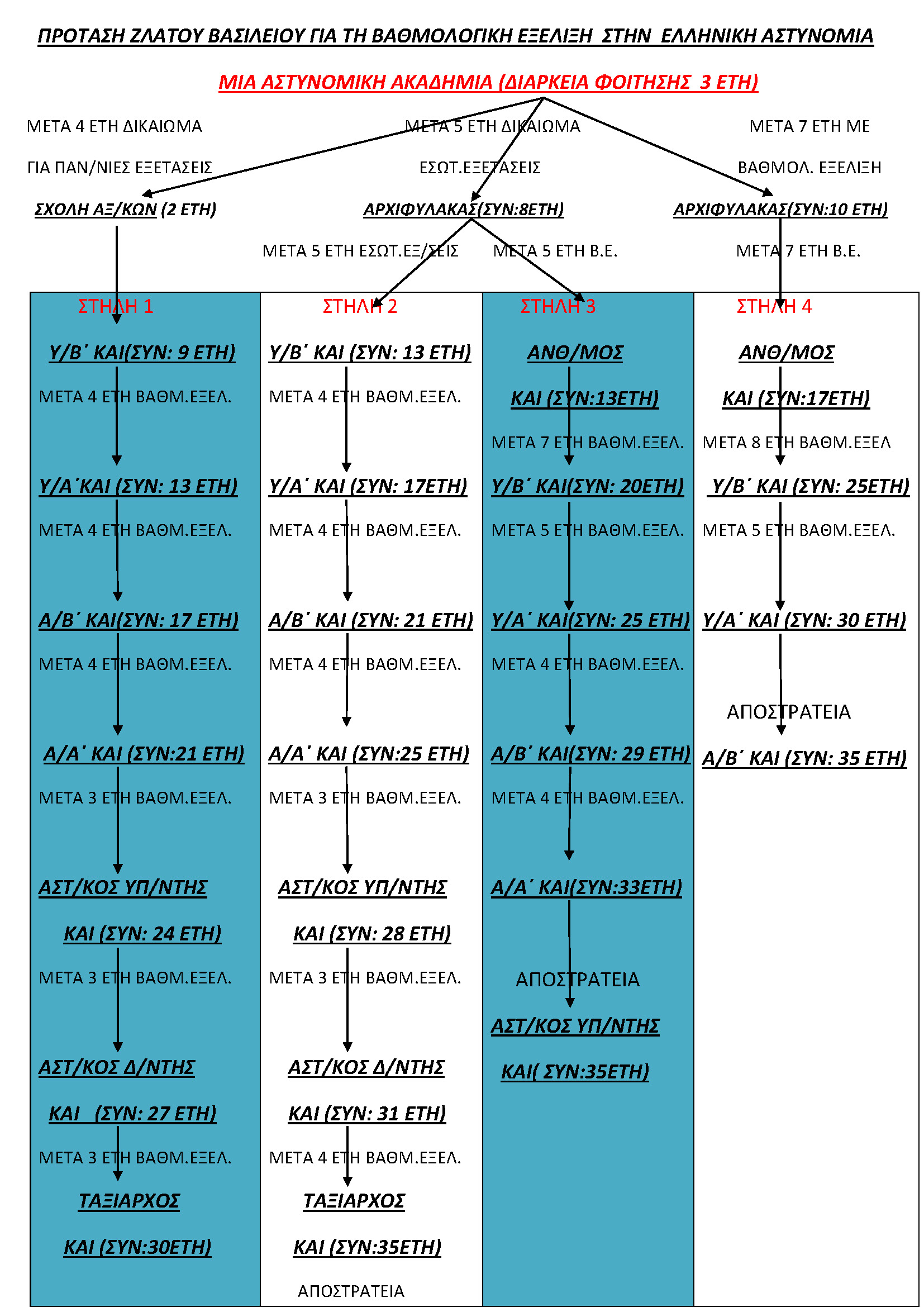 8. Η εξέλιξη του Αστυνομικού Προσωπικού θα καθορίζεται από τα έτη σε κάθε βαθμό και τα συνολικά έτη υπηρεσίας στην Ελληνική Αστυνομία.