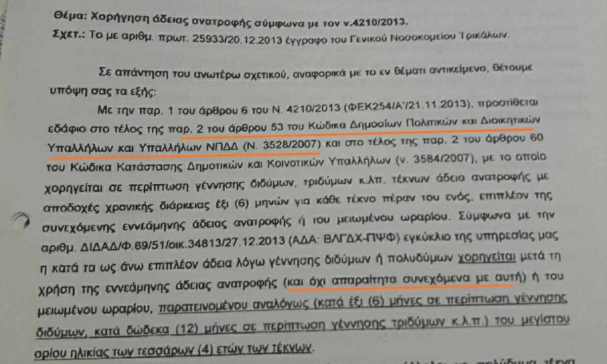 Παρατηρήθηκε μία παρερμηνεία στον τρόπο χορήγησης της άδειας που δικαιούνται οι συνάδελφοι λόγω γέννησης διδύμων ή πολυδύμων. Ειδικότερα στην περίπτωση των διδύμων οι συνάδελφοι δικαιούνται συνολικά 15 μήνες άδεια ανατροφής τέκνου, οι οποίοι χορηγούνται είτε συνεχόμενα είτε, αν το επιθυμεί ο συναδέλφους, σπαστά, δηλαδή μπορεί να λάβει αρχικά το 9μηνο και εν συνεχεία το υπολειπόμενο 6μηνο όταν το αιτηθεί. Ανάλογη ισχύ έχει η παραπάνω ερμηνεία και σε περίπτωση γέννησης πολυδύμων όπου για κάθε πλέον του πρώτου μωρού δικαιούνται επιπλέον 6 μήνες άδειας ανατροφής όπως αναγράφεται και στο παρακάτω έγγραφο.