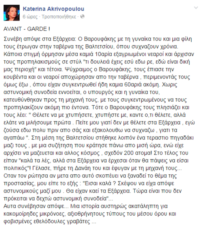 Την μαρτυρία της για το επεισόδιο που σημειώθηκε στα Εξάρχεια με τον υπουργό Οικονομικών Γιάνη Βαρουφάκη κατέθεσε στο λογαριασμό της στο Facebook η δημοσιογράφος Κατερίνα Ακριβοπούλου.