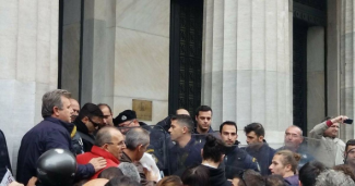 Άνδρες της αστυνομίας που είχαν παραταχθεί στο σημείο δεν επέτρεψαν αρχικά στους συγκεντρωμένους να ανοίξουν το πανό τους, ωστόσο, εκείνοι, σπρώχνοντας τους αστυνομικούς και φωνάζοντας συνθήματα, άνοιξαν τελικά το πανό μπροστά στο υποκατάστημα.
