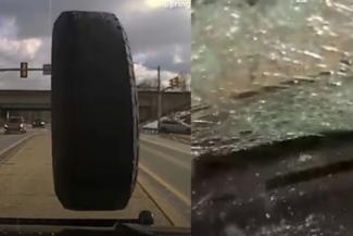 Όπως κατέγραψε η κάμερα του σταθμευμένου περιπολικού που παρακολουθούσε την κυκλοφορία σε Εθνική Οδό, ένα ελαστικό, το οποίο είχε πέσει από ένα φορτηγό, αναπηδούσε προς το περιπολικό με μεγάλη ταχύτητα, με αποτέλεσμα να πέσει πάνω στο παρμπρίζ και να το σπάσει.