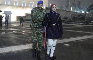 Το χιόνι, ο πάγος και οι χαμηλές θερμοκρασίες δυσκόλεψαν σημαντικά και τους Εύζωνες στον Άγνωστο Στρατιώτη στο Σύνταγμα.