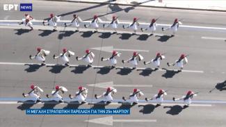 Η στιγμή που οι Εύζωνες εντυπωσιάζουν με το συγχρονισμένο πέρασμά τους στην στρατιωτική παρέλαση, στο πλαίσιο των εορτασμών για την επέτειο της 25ης Μαρτίου.