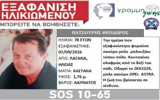 Τον αγνοούμενο 78χρονο Θεόδωρο Πατσούρη, εντόπισε πριν λίγη ώρα κάτοικος της ευρύτερης περιοχής στο Πανόπουλου της Ηλείας που ειδοποίησε τις Αρχές.