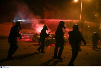 Πλησιάζοντας τον αστυνομικό φραγμό προ του Τμήματος, ομάδα (400) περίπου ατόμων που προηγείτο της πορείας, έχοντας καλυμμένα τα χαρακτηριστικά του προσώπου τους και κρατώντας στα χέρια τους μολότοφ, φωτοβολίδες, καπνογόνα, καδρόνια, μπετόβεργες και άλλα αντικείμενα ανέπτυξε ταχύτητα και επιτέθηκε με σφοδρότητα στις αστυνομικές δυνάμεις.