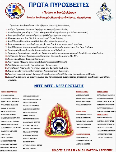 Με αυτές τις σκέψεις και με αφορμή τις επερχόμενες εκλογές για τα Συνδικαλιστικά Όργανα της Ένωσης Πυροσβεστών Κεντρικής Μακεδονίας σας προτρέπω σε μαζική συμμετοχή για να υποστηρίξετε Υποψήφιους Συναδέλφους που έχουν την βούληση και την ικανότητα,το σθένος και τοσχέδιο,την ειλικρίνεια και την εντιμότητα να ανταποκριθούν στις προσδοκίες σας και να επισφραγίσουμε την προσπάθεια για πραγματική και όχι εικονική ανανέωση.