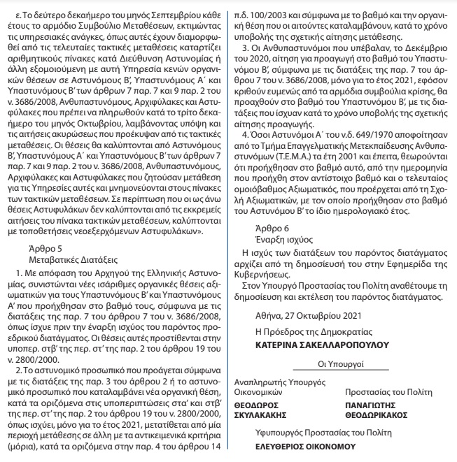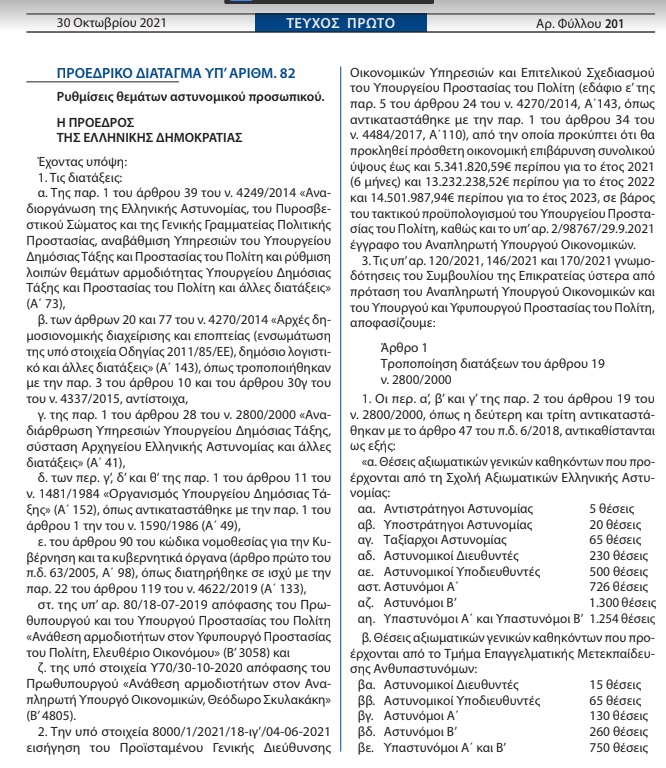 Δημοσιεύθηκε σήμερα σε ΦΕΚ το Προεδρικό Διάταγμα 82/2021 πού αφορά το νέο Βαθμολόγιο της Ελληνικής Αστυνομία.