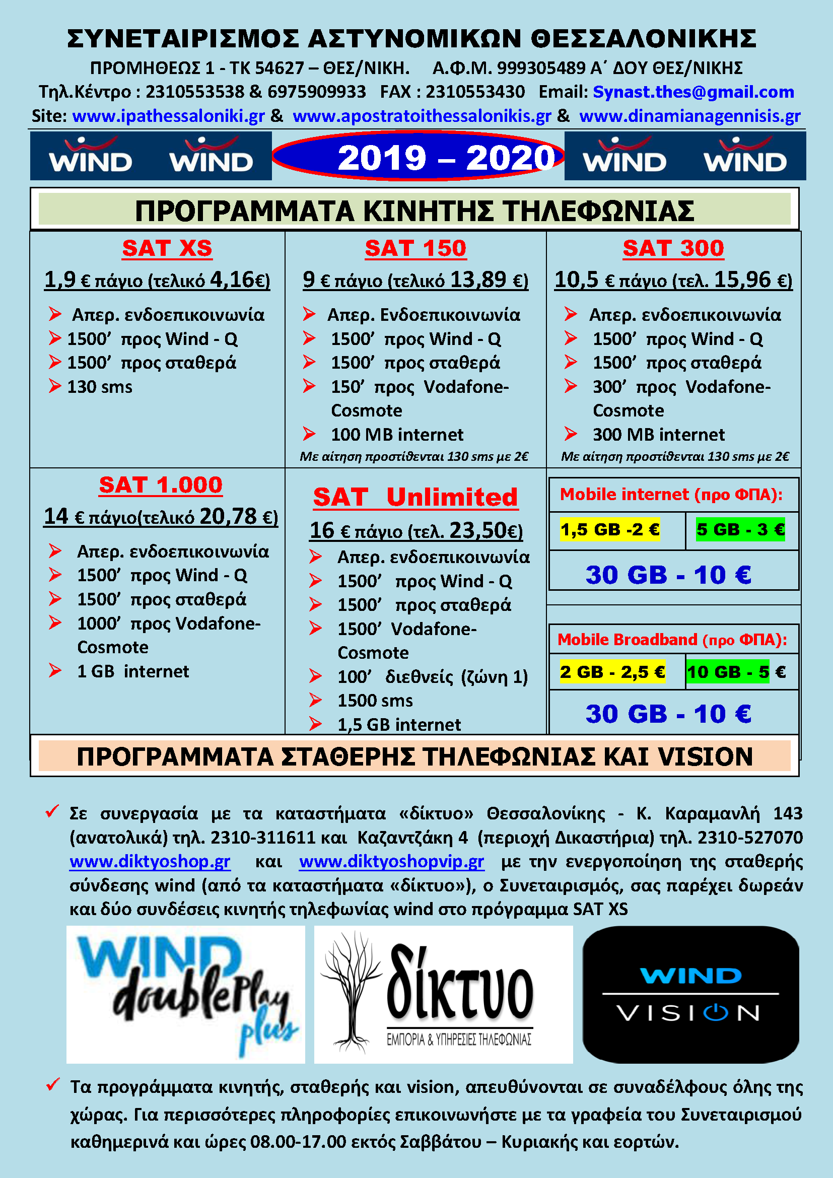 Ο Προμηθευτικός και Καταναλωτικός Συνεταιρισμός Αστυνομικών Ε.Ε. και Ε.Α. Νομού Θεσσαλονικης έχει εξασφαλίσει τα παρακάτω ειδικά πακέτα της Wind: