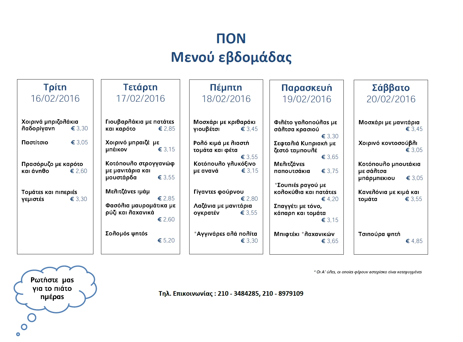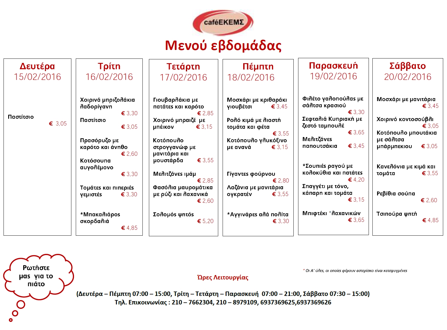 Δείτε παρακάτω τα εβδομαδιαία μενού των εστιατορίων των στρατιωτικών καταστημάτων: α) Ειδικό Κέντρο Εφοδιασμού Μονάδων Στρατού (Ε.Κ.Ε.Μ.Σ.) - www.ekems.gr,