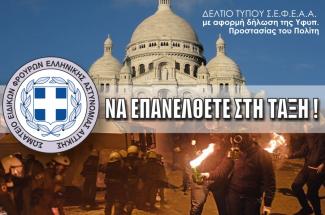 Με αφορμή δήλωση της Υφυπουργού Προστασίας του Πολίτη, κύρίας Κατερίνας Παπακώστα, το Σ.Ε.Φ.Ε.Α.Α συναισθανόμενο τον ρόλο του, αλλά κυρίως την ανάγκη να εκφράσουμε την ανησυχία των συναδέλφων μας αστυνομικών, απέναντι σε κινδύνους που μπορεί να δημιουργούν ή να δημιουργήσουν στο μέλλον, αισθήματα άγνοιας κινδύνου ή επικίνδυνες αυταπάτες από την πολιτική ηγεσία του υπουργείου μας, εκφράζουμε τα εξής: