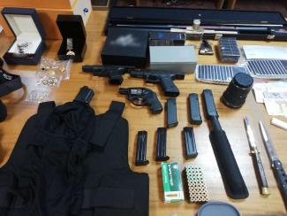 Βρέθηκαν και κατασχέθηκαν μεταξύ άλλων, πλήθος κοσμημάτων και ηλεκτρονικών συσκευών περίστροφα, πιστόλια, φυσίγγια, αλεξίσφαιρο γιλέκο, κουκούλα full face και πλήθος διαρρηκτικών εργαλείων.