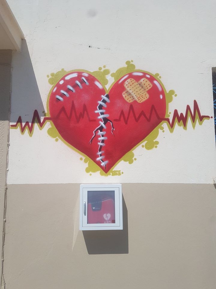 Τον απινιδωτή συνοδεύει ένα γκράφιτι, που φιλοτέχνησε, ύστερα από πρόσκληση του Ιατρικού Συλλόγου του νησιού, ο συνάδελφος, Υπαξιωματικός Λ.Σ. Δημήτρης Μορφόπουλος, ο γνωστός σε όλους με το καλλιτεχνικό του ψευδώνυμο «Dee71», που υπηρετεί στο Λιμενικό Σταθμό του Αγίου Ευστρατίου. Πρωταρχικός σκοπός του γκράφιτι ήταν και είναι να προσελκύει τα βλέμματα των περαστικών κάτι που, θεωρούμε εκ του αποτελέσματος, ότι το έχει καταφέρει.