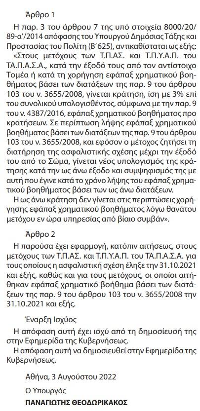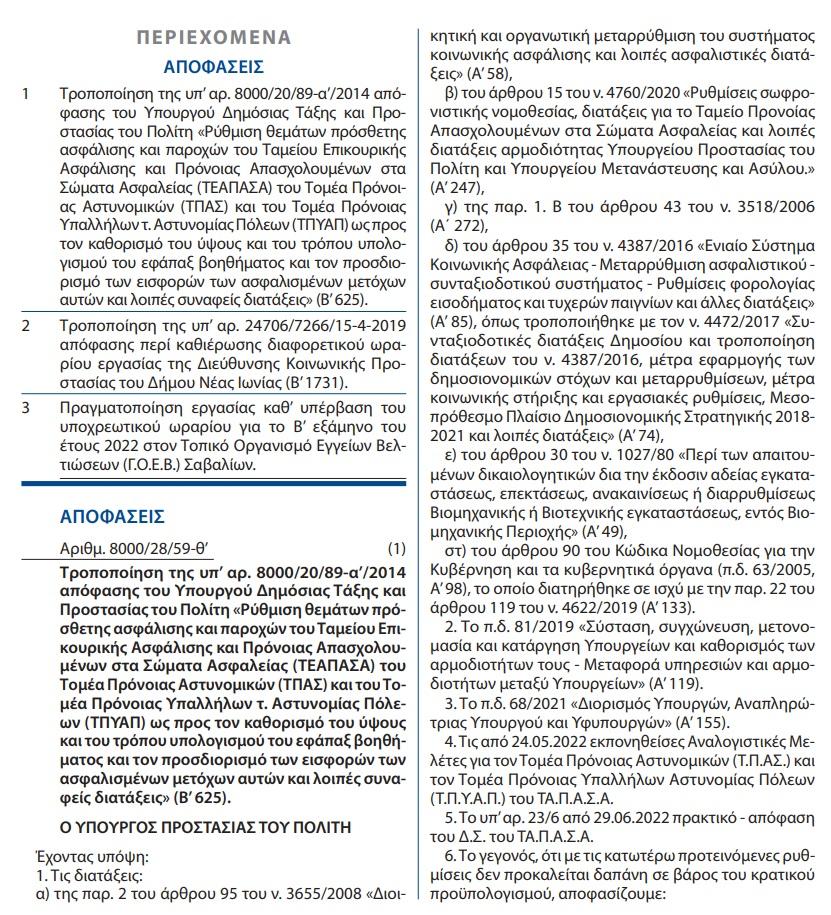 Σε συνέχεια της υπ΄ αριθ. 506/1/62 από 03-08-2022 ανακοίνωσής μας, σας γνωρίζουμε ότι δημοσιεύτηκε σε ΦΕΚ η Υπουργική Απόφαση (Β΄ 4302/11-08-2022), που αφορά ρύθμιση θεμάτων πρόσθετης ασφάλισης και παροχών του Ταμείου Πρόνοιας Απασχολουμένων στα Σώματα Ασφαλείας (ΤΑΠΑΣΑ) του Τομέα Πρόνοιας Αστυνομικών (ΤΠΑΣ) και του Τομέα Πρόνοιας Υπαλλήλων τ.Αστυνομίας Πόλεων (ΤΠΥΑΠ) ως προς τον καθορισμό του ύψους και του τρόπου υπολογισμού του εφάπαξ βοηθήματος και τον προσδιορισμό των εισφορών των ασφαλισμένων μετόχων αυτών και λοιπές συναφείς διατάξεις.