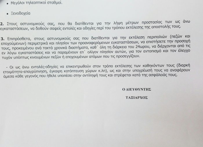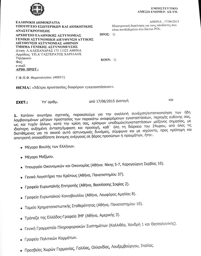 Η διαταγή που αποκαλύπτει ο «Ελεύθερος Τύπος της Κυριακής» προβλέπει την 24ωρη επιτήρηση των παρακάτω «κρίσιμων υποδομών και εγκαταστάσεων»: Βουλή των Ελλήνων, Μέγαρο Μαξίμου, υπουργείο Οικονομικών και Οικονομίας, Γενικό Λογιστήριο του Κράτους, Γραφεία Ευρωπαϊκής Επιτροπής, Γραφεία Ευρωπαϊκού Κοινοβουλίου, Ταμείο Χρηματοπιστωτικής Σταθερότητας, Τράπεζα της Ελλάδος – IMF, Γενική Γραμματεία Πληροφοριακών Συστημάτων, Γραφεία Πολιτικών Κομμάτων, μεγάλοι τηλεοπτικοί σταθμοί, γνωστά ξενοδοχεία του κέντρου της Αθήνας, όπως και πρεσβείες χωρών Γερμανίας, Γαλλίας, Ολλανδίας, Λουξεμβούργου και Ιταλίας.