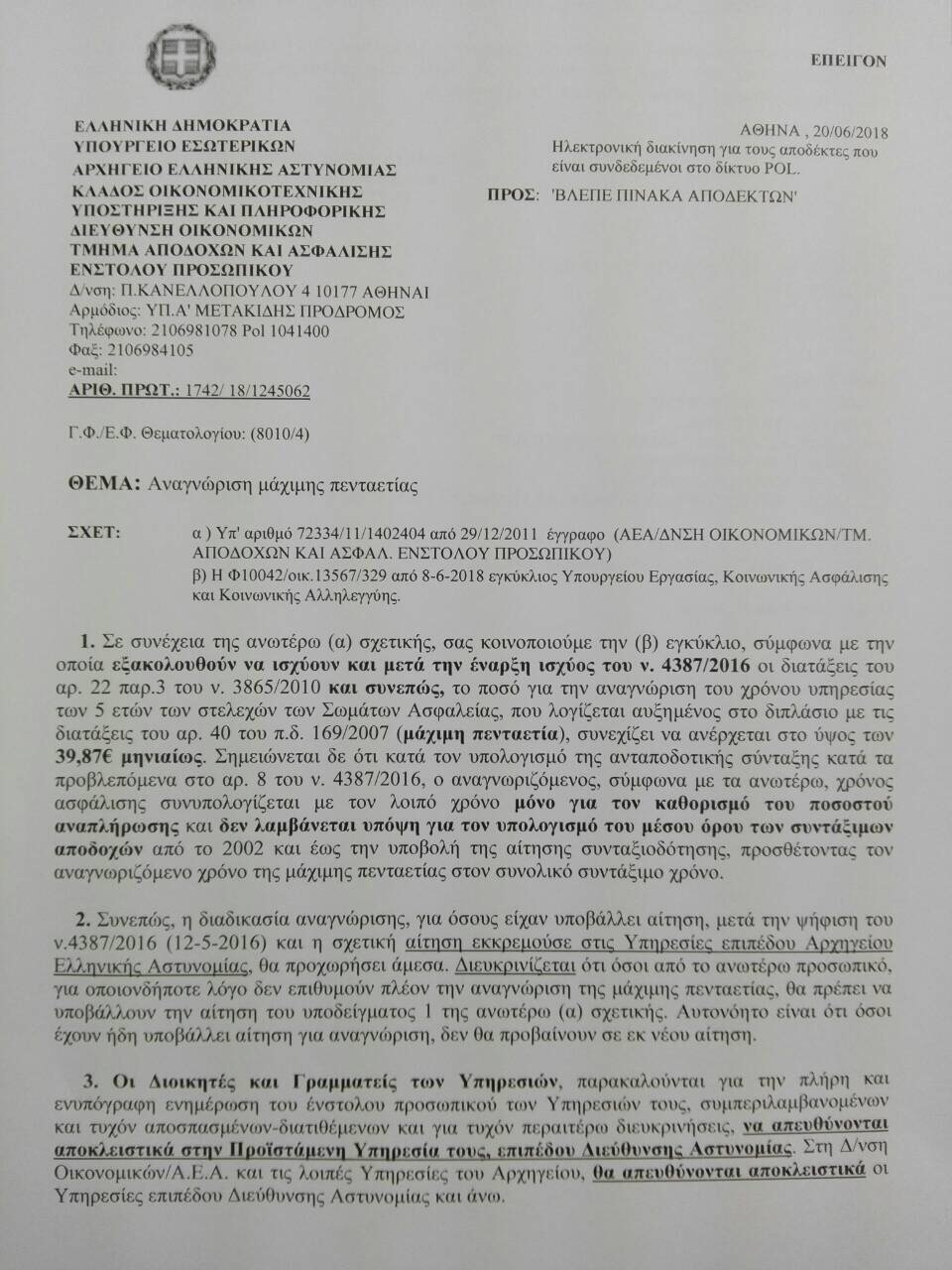Απεστάλη σε όλες τις υπηρεσίες η διαταγή του Αρχηγείου της Ελληνικής Αστυνομίας για την αναγνώριση της μάχιμης πενταετίας.