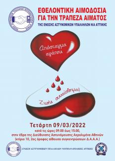 Η Ένωσή μας καλεί τα μέλη της να λάβουν μέρος στην αιμοδοσία που διοργανώνει την Τετάρτη 09/03/2022 κατά τις ώρες 09:00΄ έως 15:00΄, στην έδρα της Διεύθυνσης Αστυνόμευσης Αερολιμένα Αθηνών (κτίριο 10, 2ος όροφος αίθουσα συγκεντρώσεων Δ.Α.Α.Α).