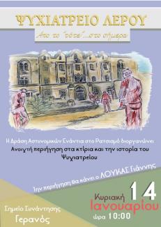 -Κυριακή 14-1-2017 και ώρα 10:00 ανοιχτή ιστορική περιήγηση στα κτίρια του Ψυχιατρείου όπου αρχικά στοιβάχτηκαν τα ανταρτόπαιδα των περίφημων Παιδουπόλεων της Φρειδερίκης, για να «γαλουχηθούν» στα ιδανικά του Πατρίς- Θρησκεία-Οικογένεια και να «αναμορφωθούν», για να ακολουθήσουν οι «χρόνιοι» , «αζήτητοι», και «μη επιδεχόμενοι βελτιώσεως» ψυχοπαθείς για την αποσυμφόρηση των Ψυχιατρείων της ενδοχώρας. Την τετραετία δε 1967-1971 μια σιδηρόφρακτη κατασκευή χώριζε την αποικία Ψυχοπαθών από τους πολιτικούς εξόριστους της χούντας. Σήμερα σε κοντέινερ που στήθηκαν στον ίδιο χώρο φιλοξενούνται χιλιάδες πρόσφυγες και μετανάστες που ξεριζώθηκαν από τον τόπο τους και έρχονται αντιμέτωποι με τα κλειστά σύνορα . Την περιήγηση θα πραγματοποιήσει ο κ. Γιάννης Λουκάς , ψυχίατρος.