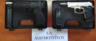 Συνελήφθησαν χθες (4-6-2018) το πρωί, στο Διδυμότειχο, από αστυνομικούς του Τμήματος Ασφάλειας Διδυμοτείχου της Διεύθυνσης Αστυνομίας Ορεστιάδας, δύο (2) ημεδαποί, ένας 70χρονος και μία 37χρονη, σε βάρος των οποίων σχηματίσθηκαν ξεχωριστές δικογραφίες για παράβαση του νόμου περί όπλων.