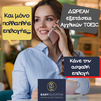 Τα Κέντρα Δια Βίου Μάθησης, Easy Education, στα πλαίσια της εταιρικής κοινωνικής ευθύνης, σε συνεργασία με την Ελληνοαμερικανική Ένωση, όντας άρρηκτα συνδεδεμένο με το σύνολο των εκπαιδευομένων πανελλαδικά και επιθυμώντας την περαιτέρω υποστήριξή τους, παρέχουν το δικαίωμα για δωρεάν εξ αποστάσεως προετοιμασία και για δωρεάν άμεση συμμετοχή σε εξετάσεις Αγγλικής Γλώσσας* με σκοπό να συμβάλλει καταλυτικά στην επιμόρφωση και πιστοποίηση όσο το δυνατόν περισσότερων ενδιαφερόμενων.