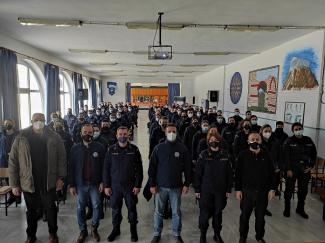 Εν συνεχεία, συνοδευόμενοι από τους ανωτέρω και τους λοιπούς εκπαιδευτές, έλαβε χώρα συζήτηση γνωριμίας με τους δόκιμους αστυφύλακες που βρίσκονται στο στάδιο της εκπαίδευσης σχετικά με τις δράσεις της Αθλητικής Ένωσης και τα οφέλη της ενασχόλησης με τον αστυνομικό αθλητισμό.