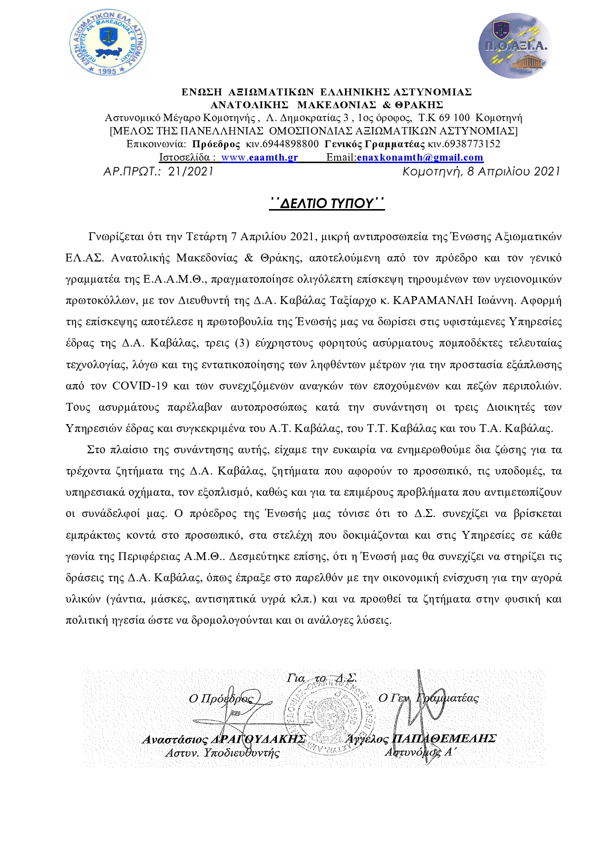 Εικόνα 22:14 | 08/04/2021 ΔΩΡΕΑ ΑΣΥΡΜΑΤΟΙ ΣΥΝΔΙΚΑΛΙΣΤΙΚΕΣ ΕΝΩΣΕΙΣ ΕΛ.ΑΣ. ΕΝΩΣΗ ΑΞΙΩΜΑΤΙΚΩΝ ΕΛΛΗΝΙΚΗΣ ΑΣΤΥΝΟΜΙΑΣ ΑΝΑΤΟΛΙΚΗΣ ΜΑΚΕΔΟΝΙΑΣ & ΘΡΑΚΗΣ
