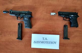 Την 31-5-2018 και την 1-6-2018, στο Διδυμότειχο, αστυνομικοί του Τμήματος Ασφάλειας Διδυμοτείχου, συνέλαβαν έναν 46χρονο και έναν 50χρονο, διότι κατείχαν, ο μεν 46χρονος, 1 πιστόλι κρότου, 1 γεμιστήρα, 1 εξάρτημα εκτόξευσης φωτοβολίδων και 1 θήκη μεταφοράς όπλου, ο δε 50χρονος, 1 πιστόλι κρότου, 1 γεμιστήρα και 1 εξάρτημα εκτόξευσης φωτοβολίδων.