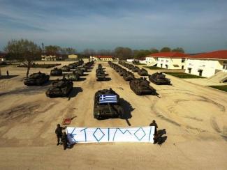 Στην μία φωτογραφία διακρίνεται μία μονάδα μηχανοκίνητου πεζικού ενισχυμένη με έναν ουλαμό αρμάτων μάχης Leopard-1A5 σε παράταξη επιθεωρήσεως, έχοντας μπροστά το επικεφαλής άρμα που φέρει μια μεγάλη ελληνική σημαία, ένα μεγάλο πανό με τη λέξη «ΕΤΟΙΜΟΙ»!