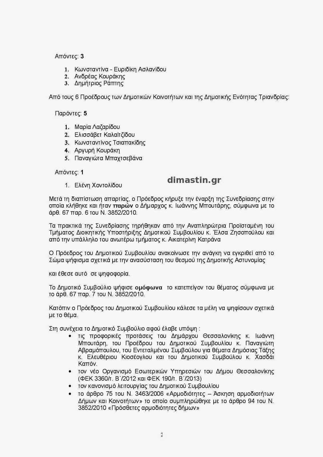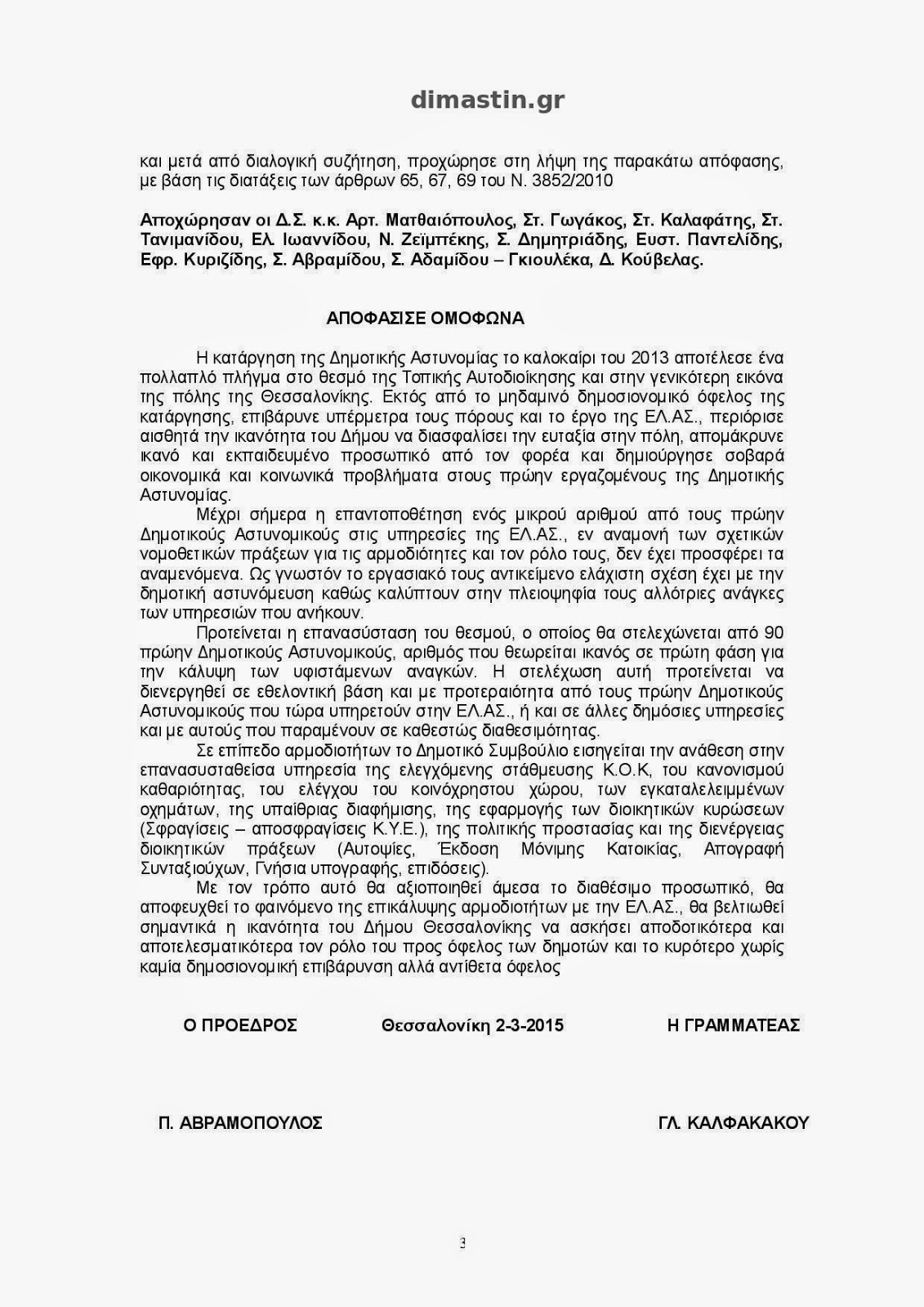 Η κατάργηση της Δημοτικής Αστυνομίας το καλοκαίρι του 2013 αποτέλεσε ένα πολλαπλό πλήγμα στο θεσμό της Τοπικής Αυτοδιοίκησης και στην γενικότερη εικόνα της πόλης της Θεσσαλονίκης. Εκτός από το μηδαμινό δημοσιονομικό όφελος της κατάργησης, επιβάρυνε υπέρμετρα τους πόρους και το έργο της ΕΛ.ΑΣ., περιόρισε αισθητά την ικανότητα του Δήμου να διασφαλίσει την ευταξία στην πόλη, απομάκρυνε ικανό και εκπαιδευμένο προσωπικό από τον φορέα και δημιούργησε σοβαρά οικονομικά και κοινωνικά προβλήματα στους πρώην εργαζομένους της Δημοτικής Αστυνομίας.