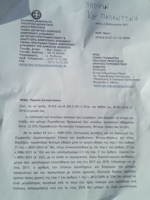 Έγγραφο του Υπουργείου Διοικητικής Ανασυγκρότησης με θέμα Παροχή Διευκρινίσεων : Σχετικά με το αίτημα ένταξης στο μόνιμο προσωπικό 2375 Πυροσβεστών Πενταετούς Υποχρέωσης.