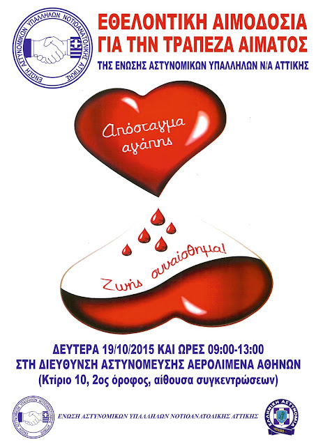 Η Ένωσή μας καλεί τα μέλη της να λάβουν μέρος στην αιμοδοσία που διοργανώνει την Δευτέρα 19/10/2015 κατά τις ώρες 09:00 έως 13:00 στην έδρα της Διεύθυνσης Αστυνόμευσης Αερολιμένα Αθηνών (κτίριο 10, 2ος όροφος αίθουσα συγκεντρώσεων Δ.Α.Α.Α).