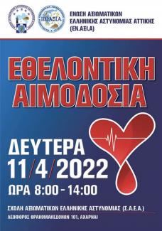 Σας καλούμε να συμμετέχετε στην εθελοντική αιμοδοσία που διοργανώνουμε σε συνεργασία με το Εθνικό Κέντρο Αιμοδοσίας για την Τράπεζα Αίματος της Ένωσης μας, στη Σχολή Αξιωματικών Ελληνικής Αστυνομίας τη Δευτέρα 11/4/2022 από ώρες 08:00-14:00.