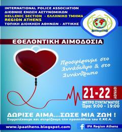 Η Τοπική Διοίκηση Αθηνών Αττικής της Διεθνούς Ενώσεως Αστυνομικών καλεί τα μέλη της αλλά και όλους τους συναδέλφους καθώς και κάθε ευαισθητοποιημένο πολίτη την 21 & 22 Ιουλίου 2019 από ώρες 09.00 έως 19.00 στο Μετρό Συντάγματος να συμμετέχουν σε εθελοντική αιμοδοσία.