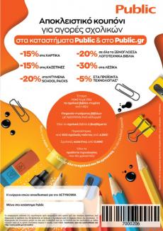 Η Ένωση Αξιωματικών Ελληνικής Αστυνομίας Αττικής εξασφάλισε, για όλους τους αστυνομικούς, ειδική προσφορά, εκπτωτικό κουπόνι, για την αγορά των σχολικών ειδών από όλα τα καταστήματα Public και στο Public.gr.