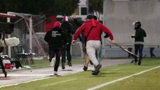 Εκτοξεύτηκαν φωτοβολίδες με «στιλό», ενώ έγιναν επιθέσεις με καδρόνια και ρόπαλα και για λίγα λεπτά επικράτησε πανικός.