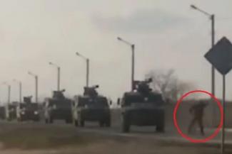 Ο άνδρας φέρεται να είναι Ουκρανός πολίτης και φαίνεται να μπαίνει μπροστά από ένα κομβόι στρατιωτικών οχημάτων σε μια απέλπιδα προσπάθεια να τα σταματήσει.