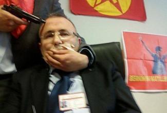 Πρόκειται για τον εισαγγελέα Μεχμέτ Σελίμ Κιράζ, φωτογραφίες του οποίου υπό την απειλή όπλου ανήρτησαν οι δράστες στο Twitter. Μάλιστα, όπως φαίνεται και από τις φωτογραφίες, οι ένοπλοι τοποθέτησαν στους τοίχους σημαίες της ακροαριστερής οργάνωσης DHKP-C.