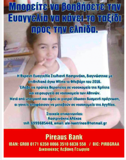 Όσοι επιθυμείτε να συνδράμετε οικονομικά στον αριθμό λογαριασμού της Τράπεζα Πειραιώς (δικαιούχος Γεωργία Λεβάκη, μητέρα της μικρής) – IBAN: GR08 0171 6350 0066 3510 6838 558