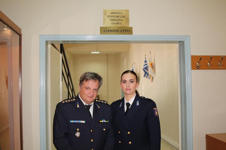 Ο Πρόεδρος της ΕΑΠΣ με την Πυραγό Κυριακή Μπόσινα, αδελφή του ήρωα συναδέλφου Πυροσβέστη Ανδρέα Μπόσινα στο αμφιθέατρο που φέρει πλέον το όνομά του