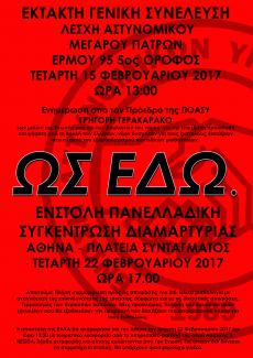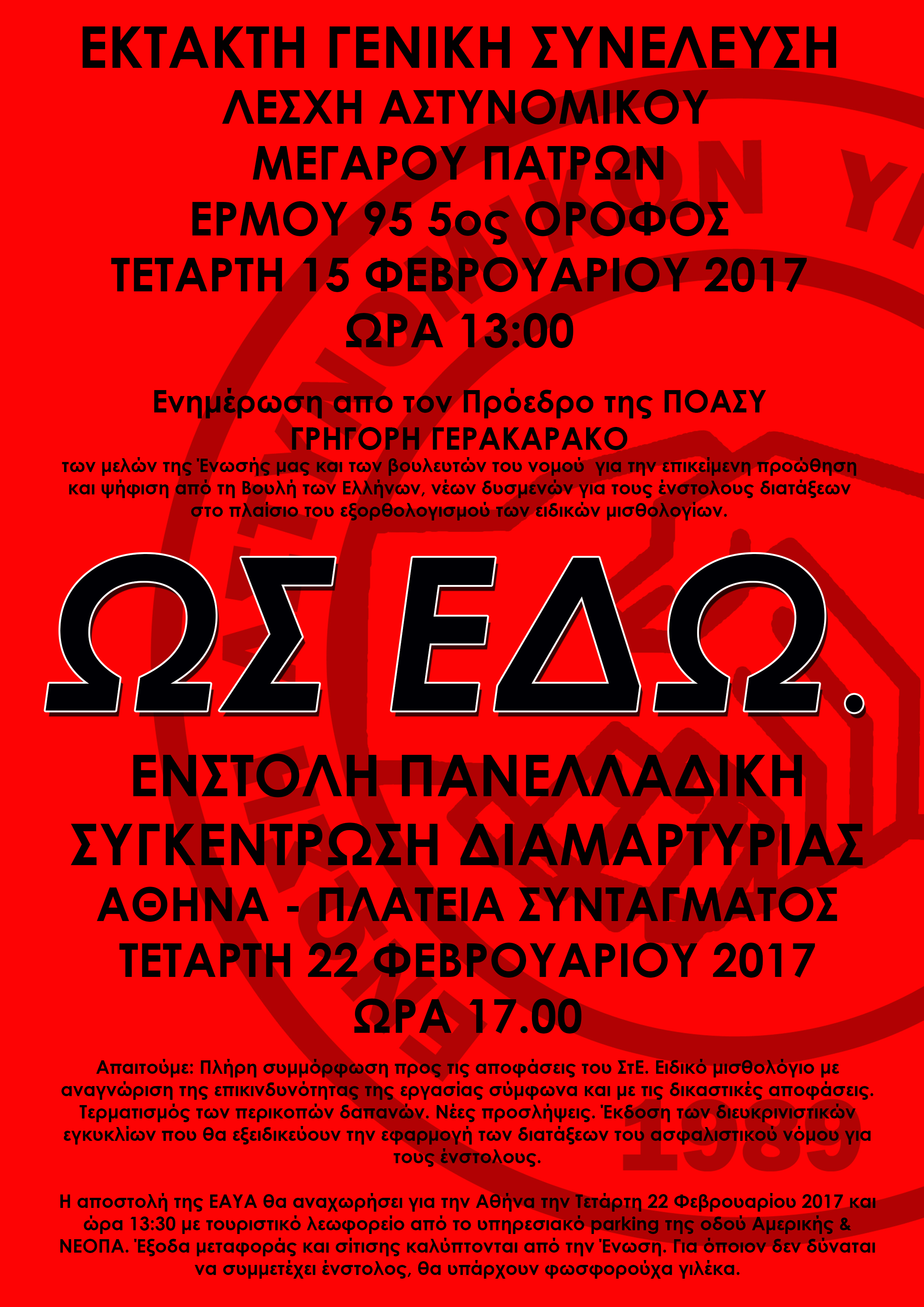 Έκτακτη Γενική Συνέλευση της Ένωσης μας την Τετάρτη 15 Φεβρουαρίου 2017 και ώρα 13:00 στην Λέσχη του Αστυνομικού Μεγάρου Πατρών, Ερμού 95.