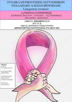 Η Γραμματεία Γυναικών, της Ένωσης μας ,σας προσκαλεί στην 1η Ημερίδα που διοργανώνει με θέμα: «ΚΑΡΚΙΝΟΣ ΤΟΥ ΜΑΣΤΟΥ – ΠΡΟΛΗΨΗ ΚΑΙ ΘΕΡΑΠΕΙΑ» με ομιλητές τον Ιατρό Γυναικολόγο κ. ΚΑΡΑΜΑΝΙΔΗ Δημήτριο και την αντιπρόεδρο του Συλλόγου Καρκινοπαθών Αλεξανδρούπολης κ. ΣΠΥΡΙΔΟΥ Αναστασία οι οποίοι θα κάνουν ανάλυση τους σοβαρούς κινδύνους που διατρέχουν οι γυναίκες, τους τρόπους πρόληψης αλλά και θεραπείας .
