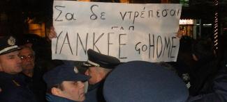 Δεκάδες μέλη αριστερών οργανώσεων και ομάδες πολιτών βρέθηκαν στο σημείο για να διαμαρτυρηθούν κατά του πρώην πρωθυπουργού με πανό που έγραφαν «Γιωργάκη λεφτά υπάρχουν» και «Σα δεν ντρέπεσαι Yankee Go Home».