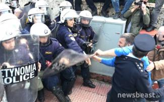 Οι συγκεντρωμένοι άρχισαν να σπρώχνουν τους άνδρες των ΜΑΤ που τους ψέκασαν με χημικά.