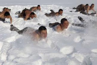 Στρατιώτες του Λαϊκού Απελευθερωτικού Στρατού ρίχνουν χιόνι στο σώμα τους σε θερμοκρασίες μείον 30 κατά τη διάρκεια εκπαιδευτικής άσκησης σε στρατιωτική βάση στο Heihe, στην επαρχία Heilongjiang της Κίνας, στις 20 Ιανουαρίου 2015.