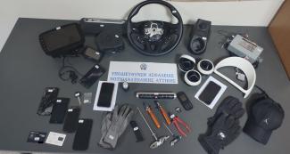 Σε διενεργηθείσες έρευνες στις κατοικίες των συλληφθέντων και στο «επιχειρησιακό» όχημά τους, βρέθηκαν και κατασχέθηκαν μεταξύ άλλων, τιμόνια και εξαρτήματα αυτοκινήτων (στροφόμετρα, ρολόγια και πλαστικά μέρη), διαρρηκτικά εργαλεία (κατσαβίδια και κόφτης) καθώς και συσκευασία, περιέχουσα κατεργασμένη κάνναβη σε μορφή σοκολάτας, μεικτού βάρους, -4,8- γραμμαρίων και συσκευασία που περιείχε -4,6- γραμμ. ακατέργαστης κάνναβης.