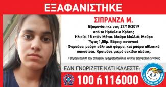Στις 27/10/2019 και ώρα 18:00, εξαφανίστηκε από την περιοχή του Ηρακλείου, Κρήτης, η Σιπράνζα Μ., 18 ετών.