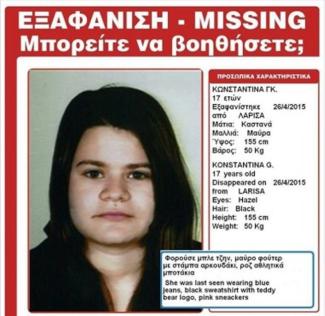 Στις 26/04/2015, πρώτες πρωινές ώρες, εξαφανίστηκε η Κωνσταντίνα Γκ., 17 ετών από το σπίτι της στην περιοχή της Χαραυγής στη Λάρισα.