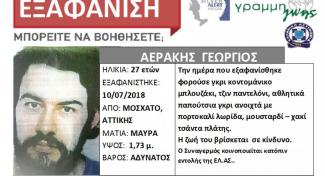 Ο 27χρονος Γιώργος Αεράκης εξαφανίστηκε στις 10 Ιουλίου από το Μοσχάτο, ενώ την ημέρα που εξαφανίστηκε φορούσε κοντομάνικο μπλουζάκι, τζιν παντελόνι και αθλητικά παπούτσια. Μαζί του είχε μία χακί τσάντα πλάτης. Ο 27χρονος έχει ύψος 1,73 μ. και είναι αδύνατος.